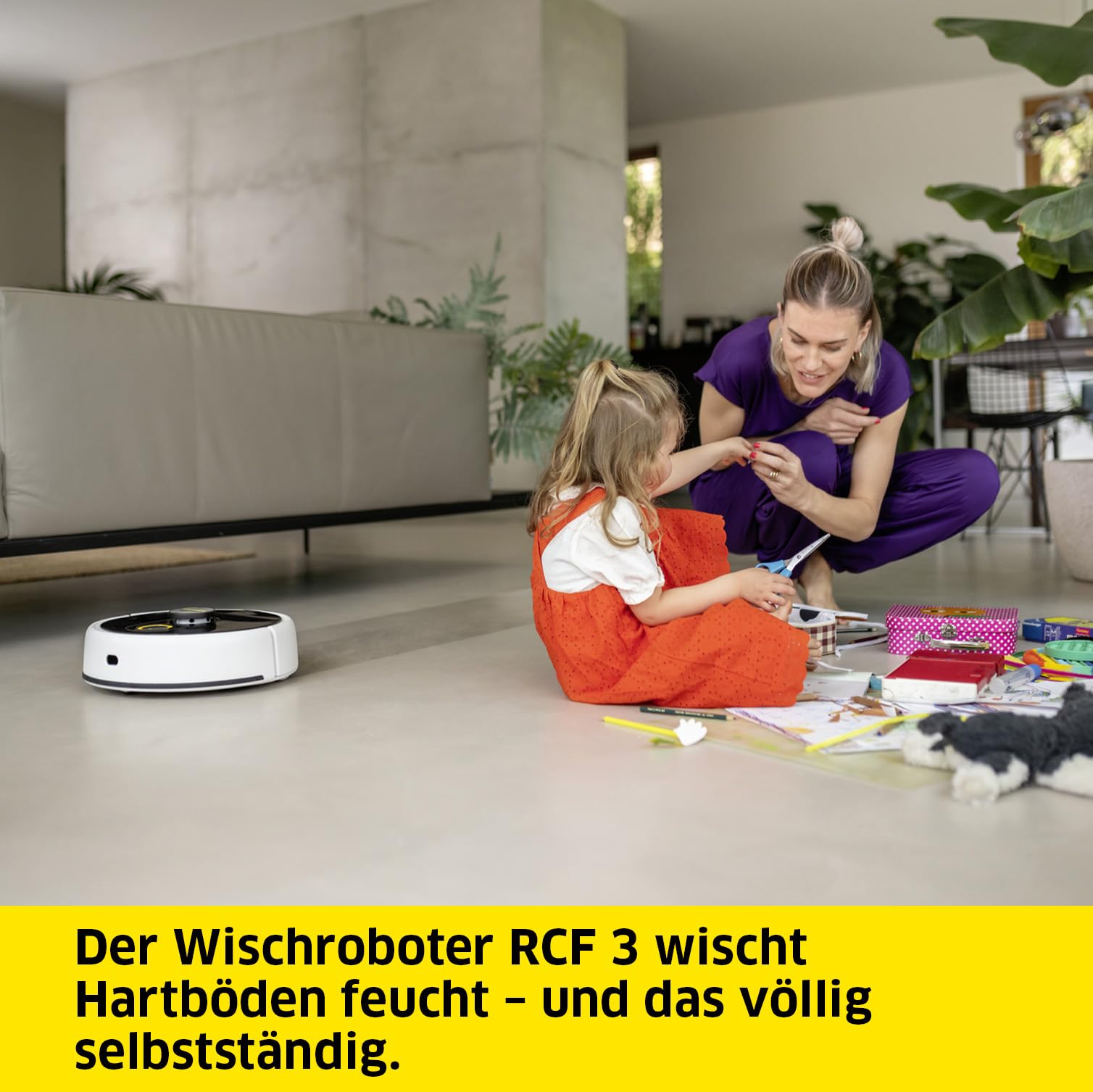 Der Kärcher RCF 3 Wischroboter reinigt Hartböden wie Fliesen, Laminat, Vinyl, PVC und Parkett gründlich und vollautomatisch. Dank moderner LiDAR-Navigation erstellt der Roboter präzise Raumkarten und bewegt sich systematisch durch Ihre Wohnung, während Sensoren Hindernisse und Höhenunterschiede erkennen.
